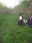 Zuerst geht der Sammler aber auf Nahrungssuche, bevor er dann zum Jäger des besten Zeltplatzes wird. In einem riesigen Supermarkt decke ich mich mit Essbarem für die nächsten 24h ein. Dann kundschafte ich die Gegend ein bisschen aus, vor allem die verlassenen Ufer des Flusses. Dort gibt es immer wieder mal etwas Wald, und bei genau so einem Wald finde ich mein Plätzchen. Es liegt am Ende einer verwilderten Forststraße. Nur muss ich da erst mal hin, ohne von mehreren Anglern blöd angeglotzt zu werden, die direkt an der Einfahrt in diese Straße fischen. Außerdem ist es ja erst 16 Uhr, also noch nicht wirklich Zeit zum Zelt aufbauen und schlafen gehen. Das Lager will ich sowieso erst bei Dämmerung aufschlagen. Der Grund: mein Plätzchen liegt direkt vis-à-vis zu einer großen Kanalschleuse, dazwischen ist allerdings ein hoher Damm. Der Schleusenwärter mit seinem Peugeot fährt allerdings ein Stück lang genau auf diesem Damm, wenn er den eingezäunten Bereich verlässt. Als ich mich nachmittags dann auf diesem Damm einmal hinsetze und endlich zum Lesen in der Bibel komme, werde ich von ihm auch gleich angeschnauzt, ob ich denn den Radweg suche – der sei anderswo –, und dass ich aufpassen solle – das Sitzen am Damm sei gefährlich. Aha. Also von dem Typen will ich nicht beim Biwakieren gesehen werden. Deshalb versuche ich später, meinen Spot möglichst weit von der Straße zu entfernen, soweit es halt geht bei den ganzen Bäumen, die da so im Weg herumliegen.